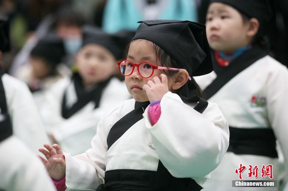 3月13日,南京市淺草幼兒園105名剛入學的小萌娃們在金陵國學堂的老師帶領下,著漢服行古禮,拜圣人誦孝經,寫人字學感恩舉行了一場別開生面的人生“開筆禮”。同時在現場還向南京及周邊城市3-12歲的少年兒童發出一起來參加今年的“國韻寶貝六一晚會”的邀請,共同體味傳統文化的韻味。記者 泱波 攝