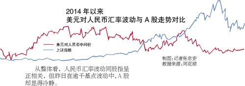 從整體看,人民幣匯率波動同股指呈正相關,但昨日在逾千基點波動中,A股卻顯得冷靜。