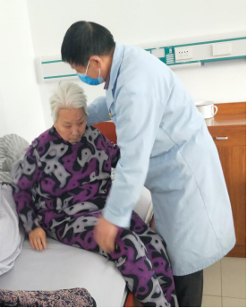 左仁義是本院一名普通的養老護理員,年近六旬的他自2018年開始從事養老護理工作,本著踏踏實實工作,不辜負每位家屬的重托的原則,認真仔細的照顧好每位老人。原來的他是一名鄉村醫生,擁有自己的診所,原本的生活不算富裕,倒也是衣食無憂;一次偶然的機會,他親眼見到了養老護理員的日常工作,和原來聽說的、自己想象的養老院有所不同,他說:“養老護理院又成立‘頤養中心’,老人住在這里舒心安心,有病的不出院還能治療康復,醫保還能報銷,我干一輩子大夫,常見病我還能有所用武之地,我服務的多是失能、半失能、植物人等危重老人,還有臨終關懷老人,老人每兩個小時一翻身,檢查有沒有要大小便,防止壓瘡發生,真真正正的達到“醫養結合”、“兩院一體”、“有病治病,無病療養”的模式。老人和子女滿意,這是我最大的快樂!于是他在第一時間加入了莒南榮軍護理院這個大家庭,并開始了他日復一日的養老護理服務工作。