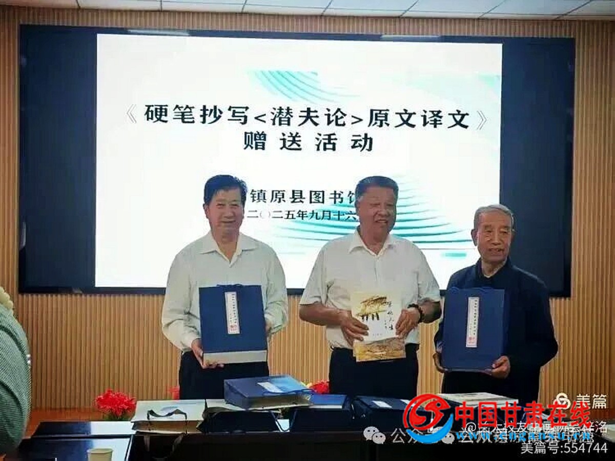 中國甘肅在線訊 2025年9月,一場以硬筆書法為媒介、跨越城鄉的文化接力,在隴原大地恢弘展開。鄉賢楊千榮先生發起的《硬筆抄寫〈潛夫論〉原文譯文》贈書活動,自王符故里鎮原縣燃起星火,至省城蘭州明志學校形成燎原之勢,不僅是一次文化資源的傳遞,更是一場貫通古今、聯動社會的文脈復興實踐,標志著傳統文化傳承進入多元共筑、創新發展的新階段。