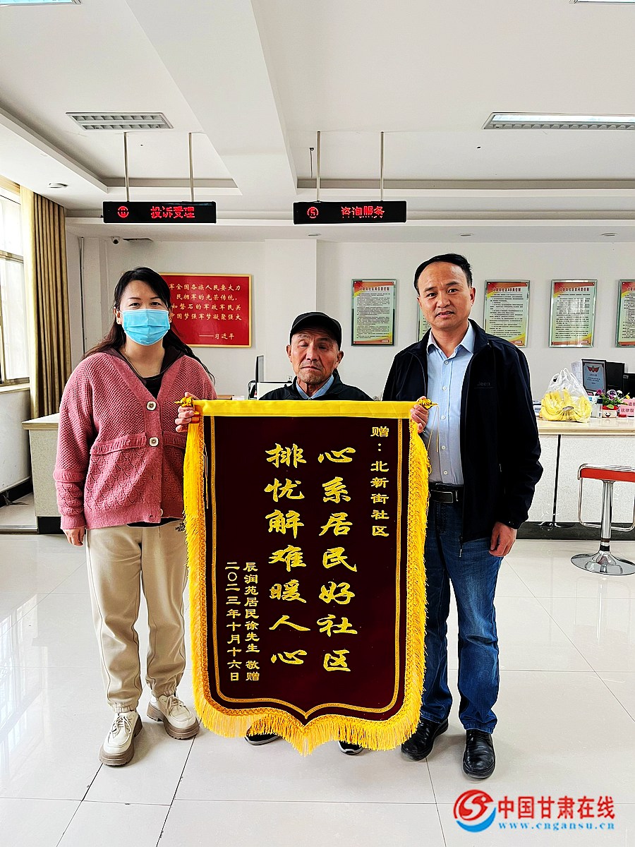 近日,肅州區東北街街道北新街社區居民徐先生攜家人專程來到社區,將一面印著“新系居民好社區 排憂解難暖人心”的錦旗送到社區領導手中,以此表達社區黨委真正為民辦實事的感激之情。
