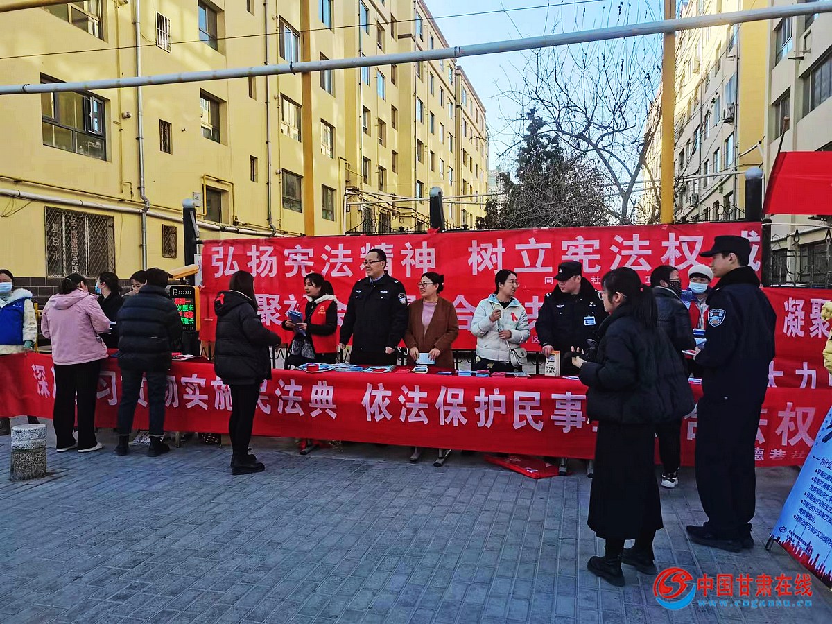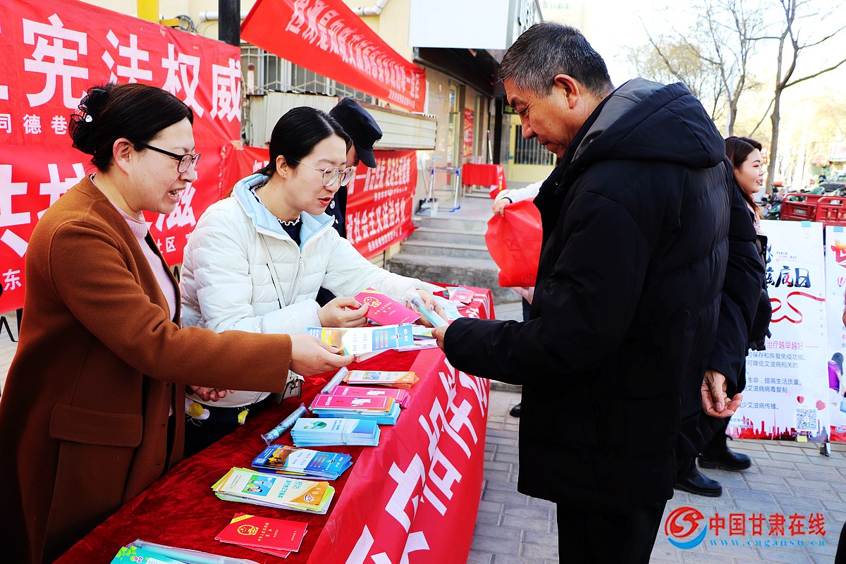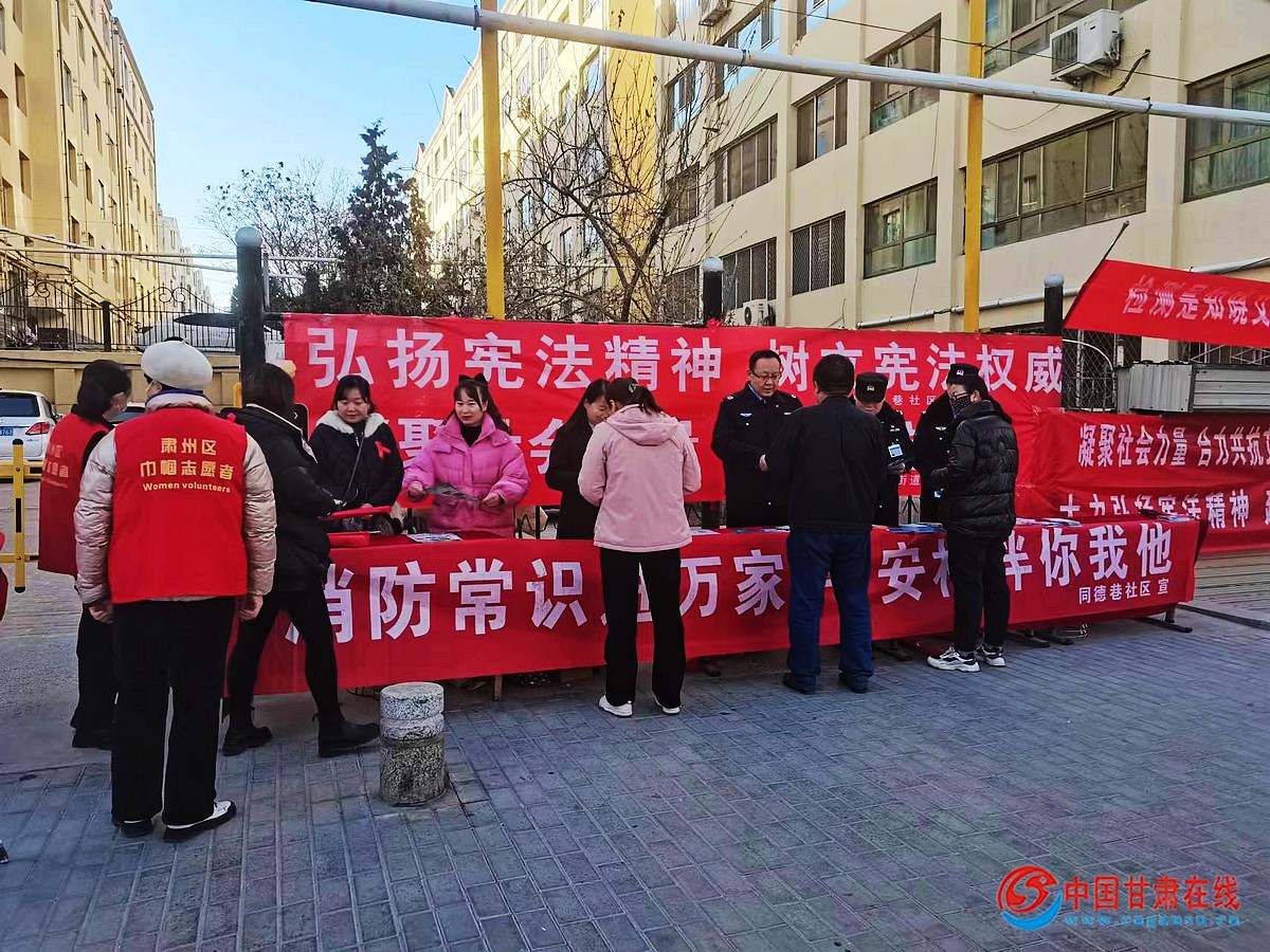 中國(guó)甘肅在線肅州訊 2023年12月4日是第十個(gè)國(guó)家憲法日,肅州區(qū)東北街街道同德巷社區(qū)聯(lián)合西北街司法所和西關(guān)派出所,開(kāi)展了以“弘揚(yáng)憲法精神、樹(shù)立憲法權(quán)威”為主題的集中宣傳活動(dòng)。