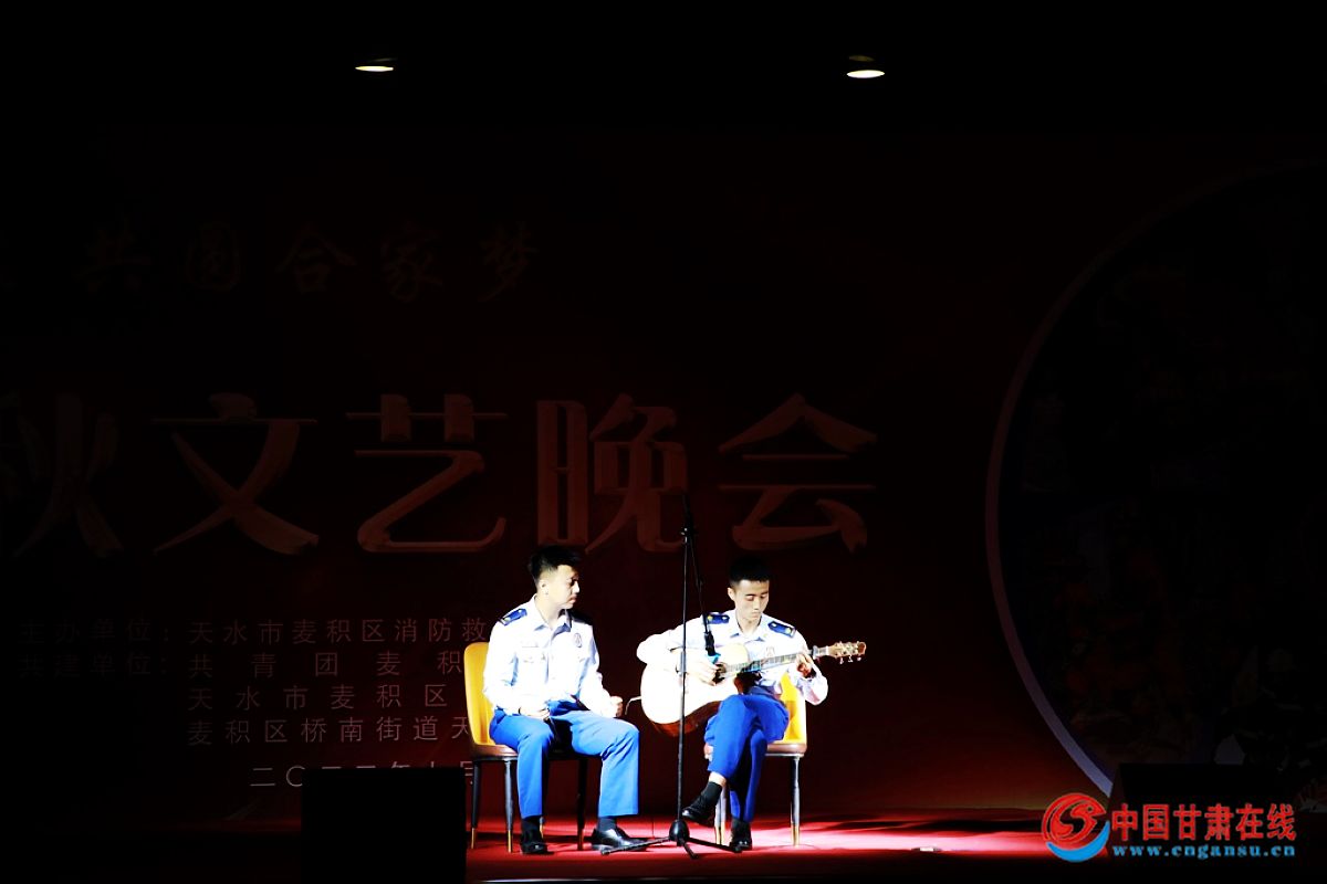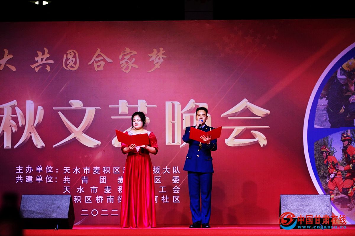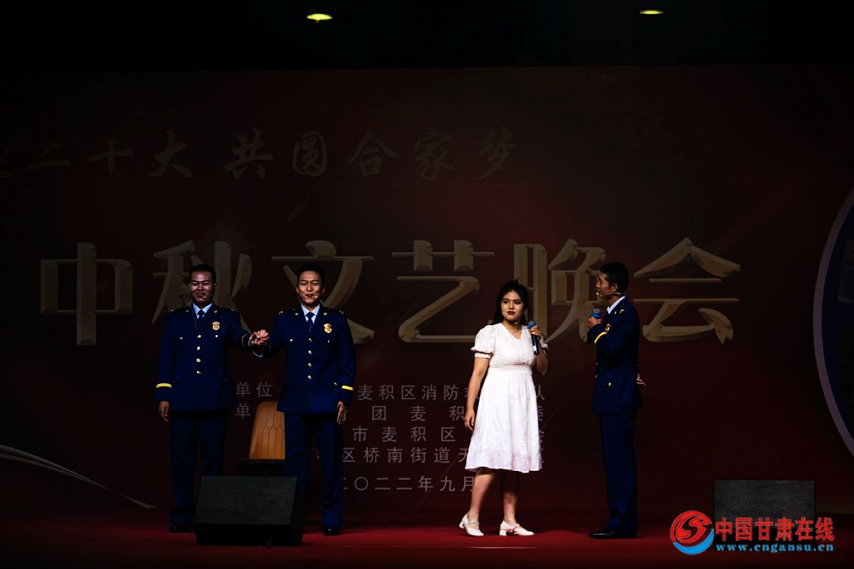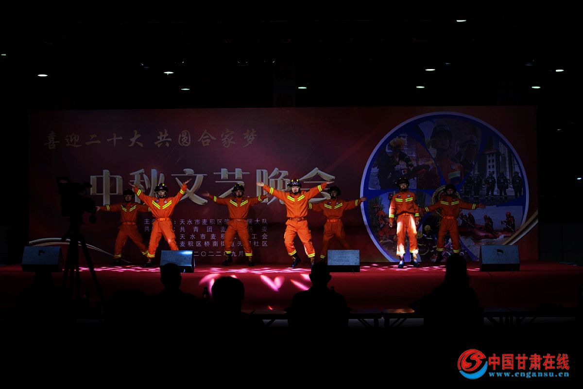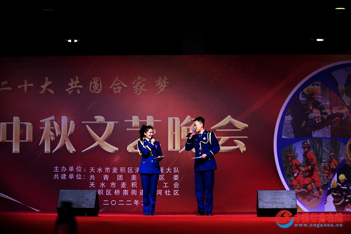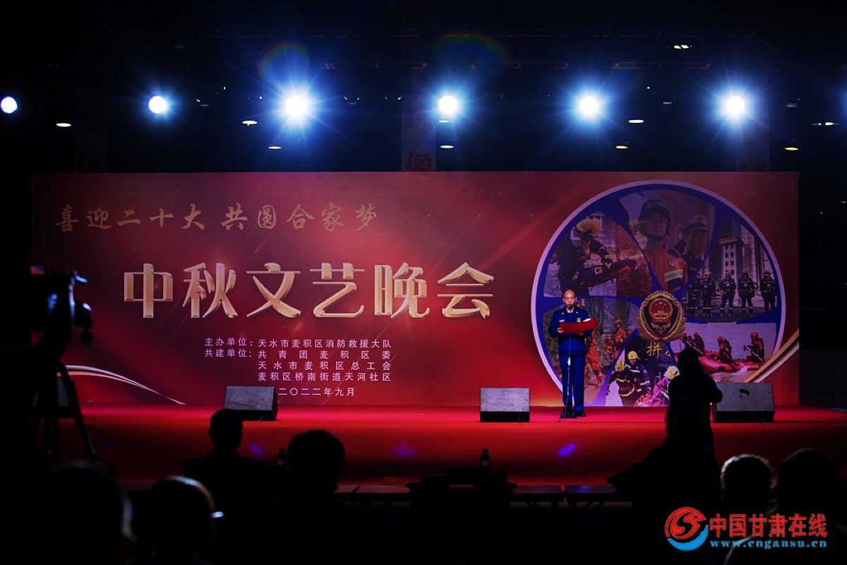 中國甘肅在線麥積訊 為了切實做好戰時關懷工作,歡度中秋佳節,舒緩指戰員的思鄉情緒、緩解執勤戰備壓力,使全體指戰員全身心投入到黨的二十大消防安保工作中去。9月8日,麥積大隊聯合共青團區委、天水市麥積區總工會、麥積區橋南街道天河社區舉辦“喜迎二十大,共圓合家夢”文藝晚會。天水支隊張磊政委、張曉斌主任出席了此次活動。