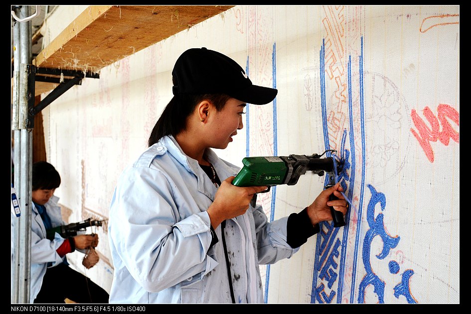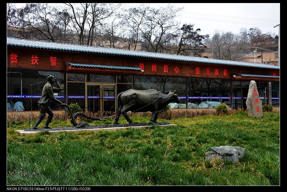 村莊南部有一不大的臺地,臺地上建有一條約5米寬的水泥路,為村子主巷道,主巷道旁安裝有一盞盞太陽能路燈。主巷道北有多條南北向的小巷道連通建在坡地上的農(nóng)戶院落,路旁一石塊砌筑的護坡上懸掛有“人文中岔,美麗鄉(xiāng)村”字樣,護坡上筑有圍墻,墻面上繪制二十四孝圖,依次為孝感動天、戲彩娛親、鹿乳奉親、百里負米、嚙指痛心、埋兒奉母、親嘗湯藥、拾葚異器、蘆衣順母、賣身葬父、刻木事親、懷橘遺親、公媳探母、扇枕溫衾、行傭供母、聞雷泣墓、哭竹生筍、臥冰求鯉、扼虎救父、恣蚊飽血、嘗糞憂心、乳姑不怠、滌親溺器、棄官尋母,由歷代二十四個孝子從不同角度、不同環(huán)境、不同遭遇行孝的故事匯集而成。主巷道西建有中岔地毯加工扶貧車間,旁有中岔村電子商務服務點,路旁一農(nóng)家院落粉刷為白色的墻上書有“守護美麗鄉(xiāng)愁”等字樣,墻面上掛有鋤、木杈、籠嘴、連枷、鞍子、牛肚革、木锨、篩兒、簸箕、尖擔、鐮刀、耱、夾嘴、夾板、糞斗等各種農(nóng)用器物。車間前有草坪,草坪中塑有農(nóng)人耕作像,前面一頭體格健壯的“耕牛”駕在牛肚革上,牛肚革兩端以繩子連接木犁,“耕牛”頭稍前傾,四蹄蹬地,奮力前行,后面一“農(nóng)人”上衣(俗稱汗袒)袖子、褲子褲腳均高高挽起,右手扶犁,左手揚鞭,吆喝“耕牛”正在犁“地”,形態(tài)逼真,栩栩如生。草坪中還立有一塊上小下大呈槍狀的巨石,上書書法家申君明題寫的“農(nóng)耕園”三個紅色大字。走進中岔地毯加工扶貧車間,多名就地吸納的女工正在手持工具生產(chǎn)作業(yè),地上擺放著多件地毯成品,掛在墻上的一幅以甘谷風景名勝大像山為素材制作的地毯特別引人注目。