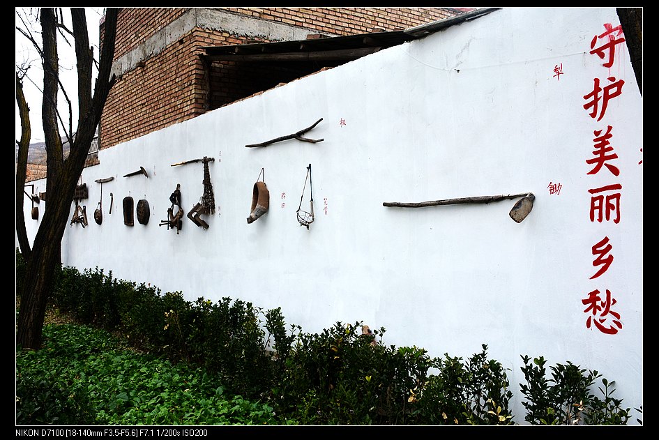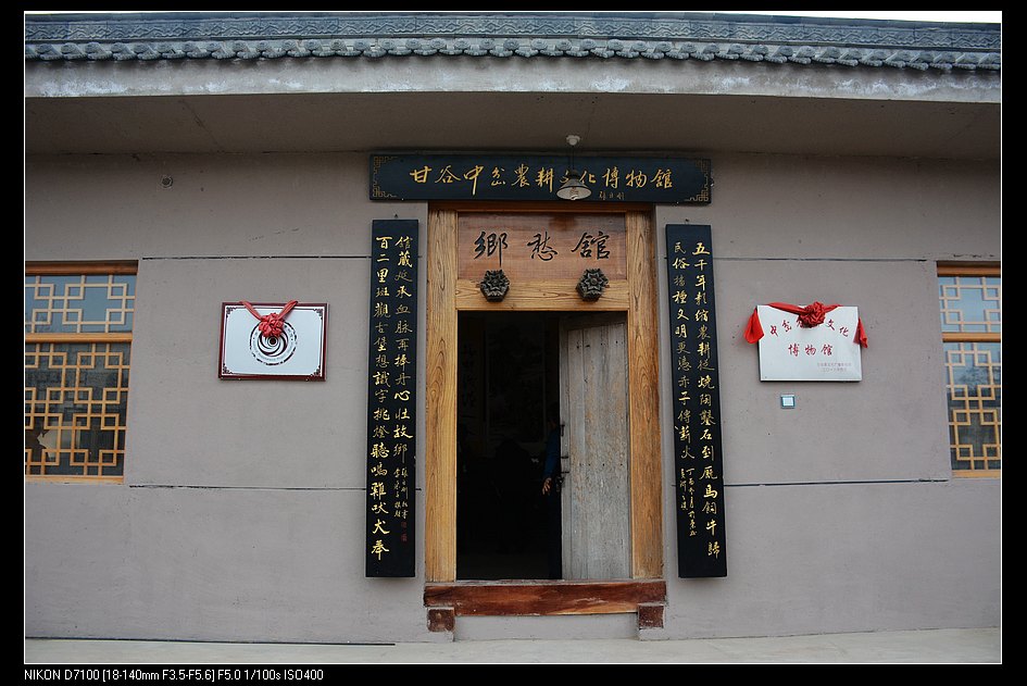 沿關帝廟墻外通道前行,進入后院,走進船形古堡的“船尾”,就是中岔農(nóng)耕文化博物館。中岔農(nóng)耕文化博物館如同一幅扇面,“扇面”頂端的堡墻下按順時針方向依次建有甘谷縣中岔村文化園(福壽堂)、甘谷中岔農(nóng)耕文化園(文化藝術館)、人民公社大食堂、積善堂、中岔農(nóng)耕文化博物館(鄉(xiāng)愁館)等建筑。除地處“船”尾端的積善堂為卷棚頂式建筑外,其他建筑均按當?shù)孛窬油聊窘Y(jié)構格式建造,一坡水馬鞍架屋檐或凹形平面屋頂,實木門窗,上覆青瓦,保留了原汁原味的傳統(tǒng)農(nóng)家民居特色。門楣上刻有書法家題寫的“耕讀第”“勤儉居”等文字,這些有溫度的古訓和處世治家格言,鐫刻在門楣上,也刻寫在中岔人的心中,與當?shù)孛窬语L格融為一體,古樸典雅,相得益彰。中岔農(nóng)耕文化園還收藏有陳忠實、范曾、蘇士澍、吳鴻清等全國書畫名家為中岔題寫的牌匾或捐贈的書畫作品。